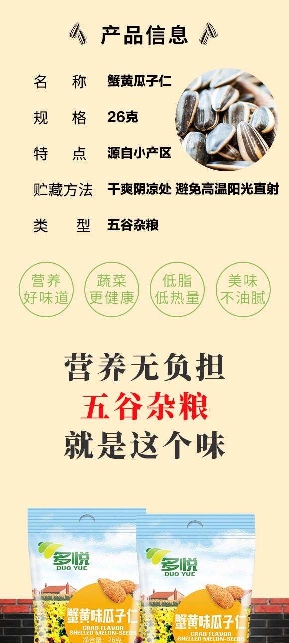 馬上給安徽悅心食品有限公司招商產(chǎn)品【多悅蟹黃味瓜子仁26g】留言獲取更好的商業(yè)機會!
